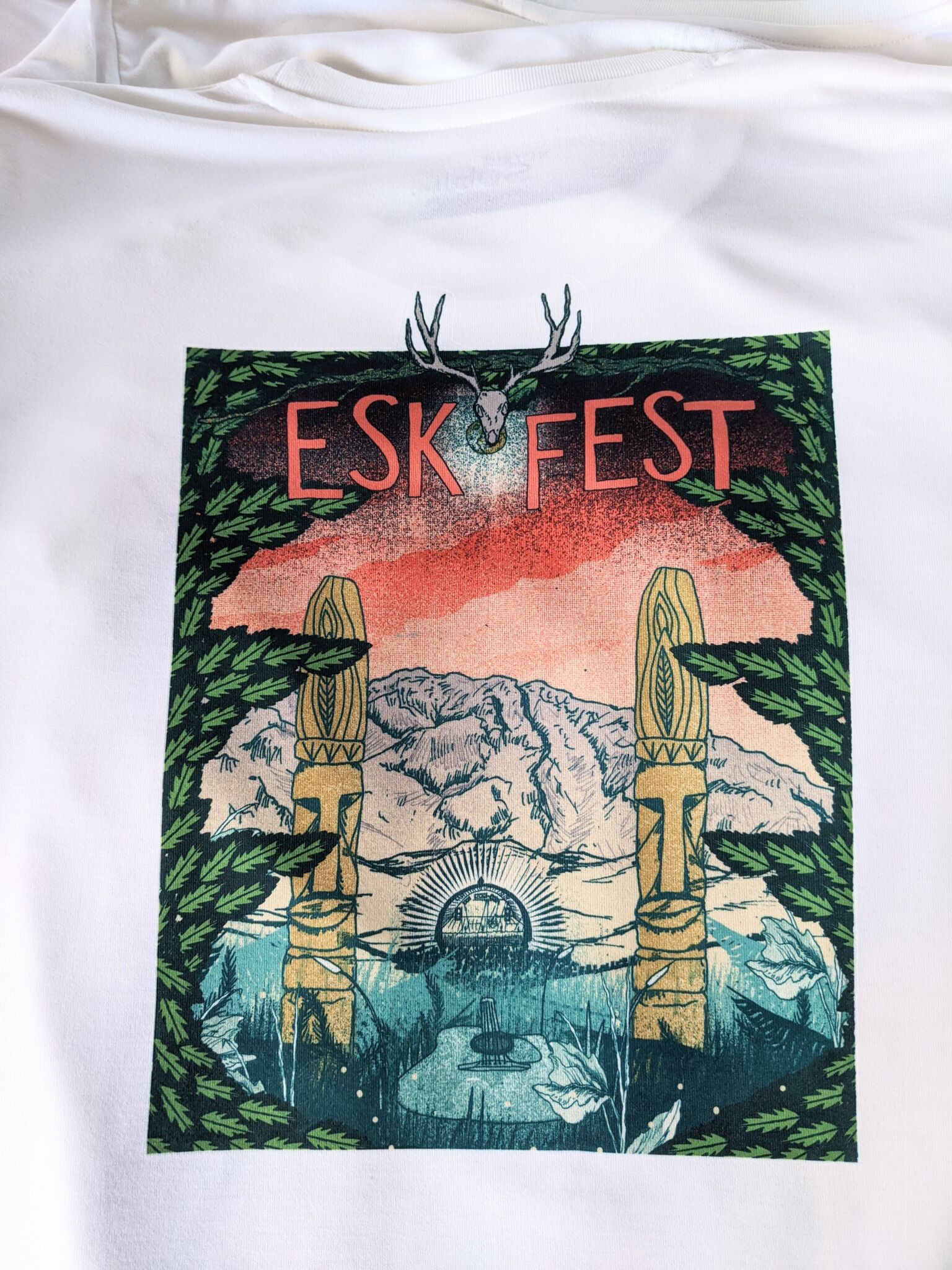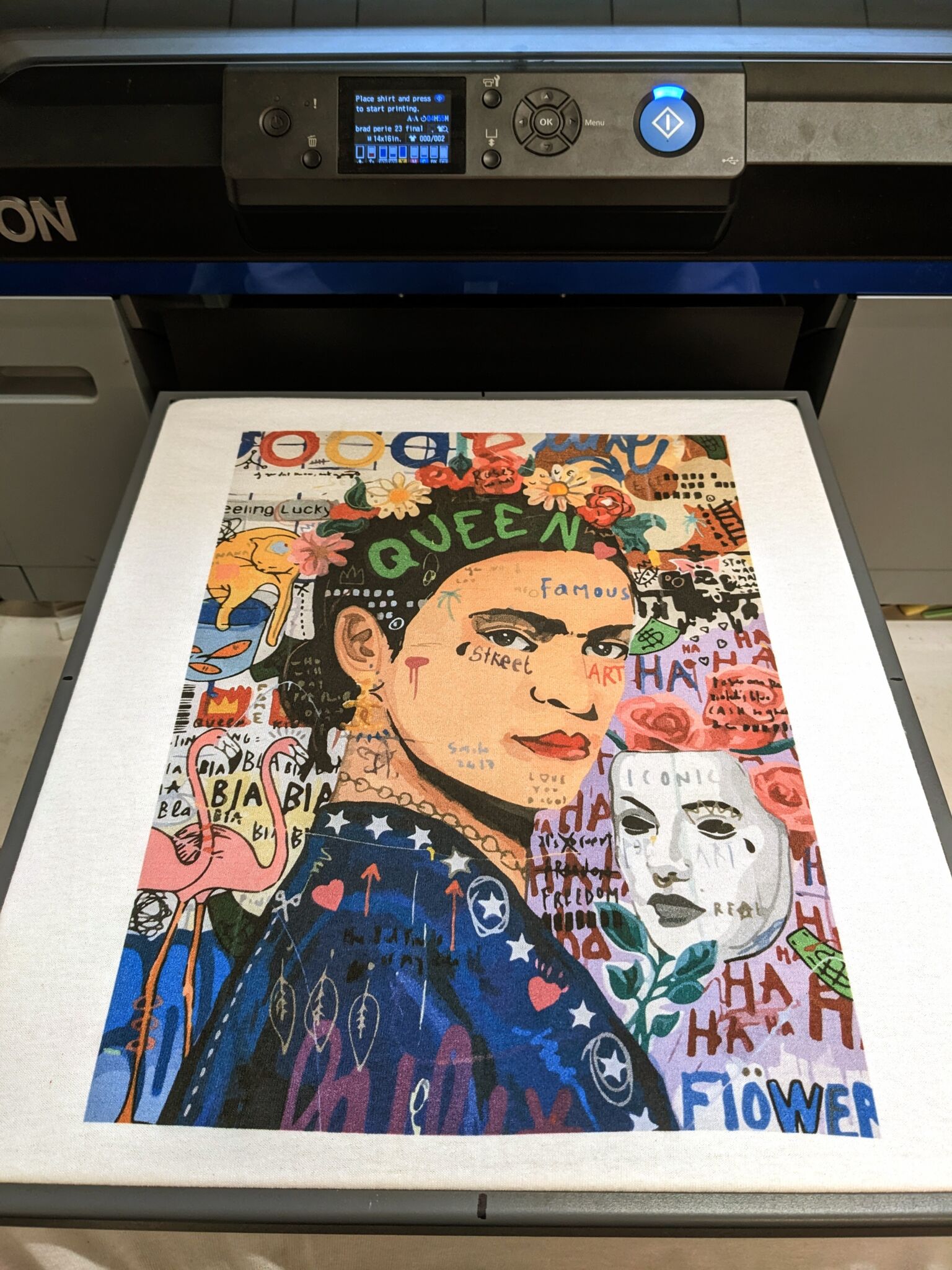 The garment is first treated and dried, then fed into the printer and finally cured using a heat press.